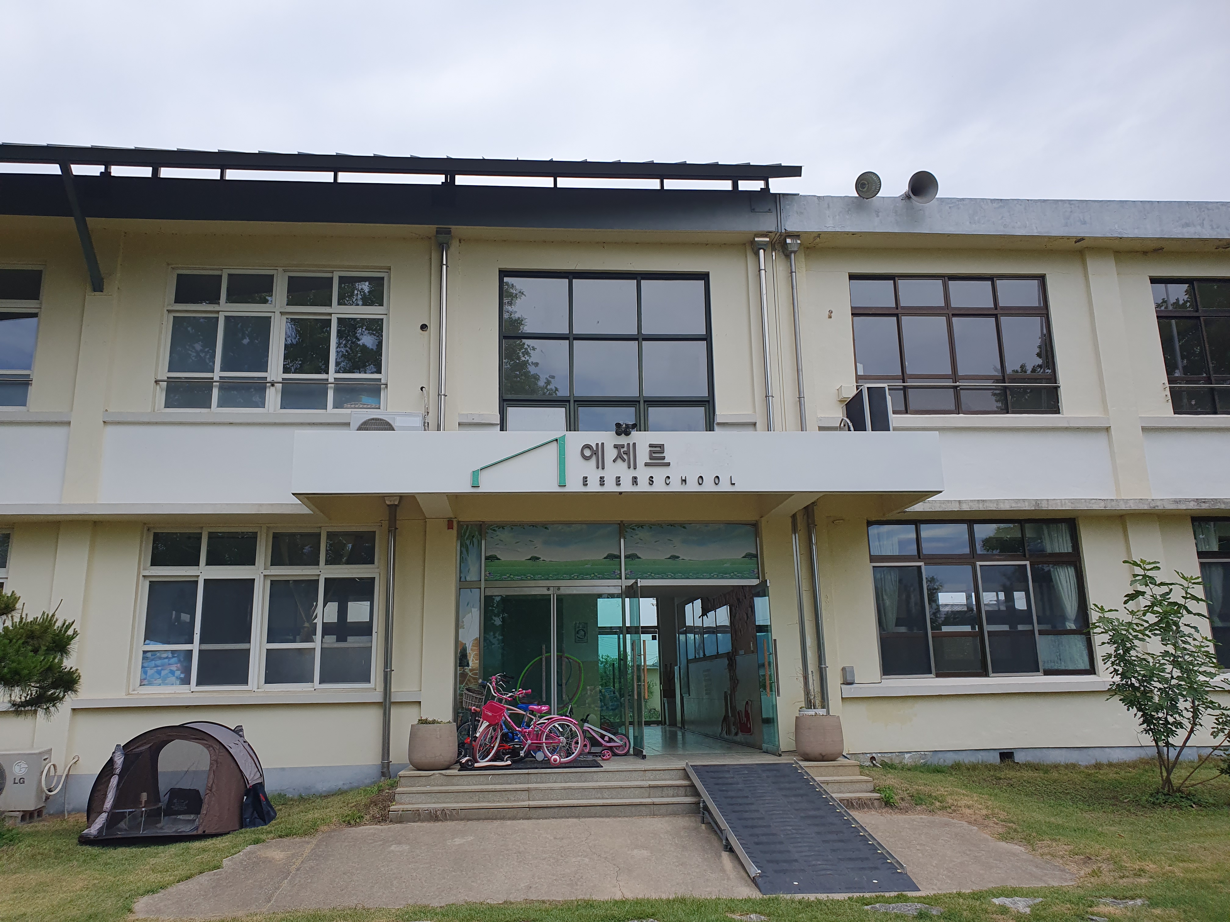 폐교를 캠핑장으로 만든 곳인데 넓은 운동장에 잔디가 깔려 있어 아이들이 신나게 뛰어놀수 있는 곳이었습니다.